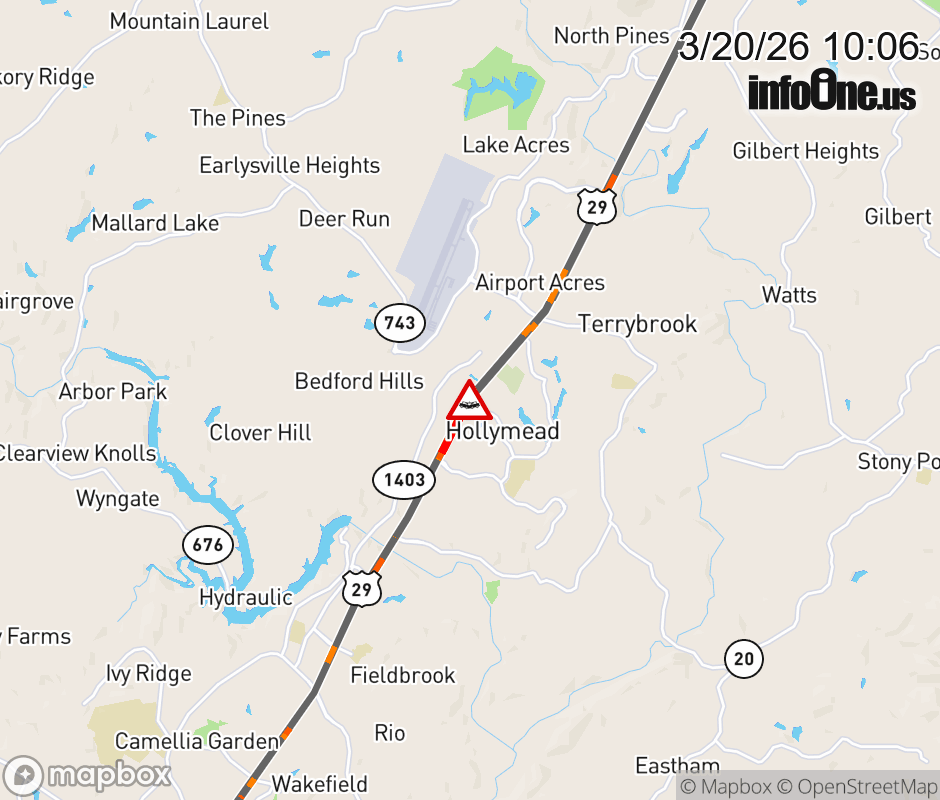 On US-29 North in the County of Albemarle, in the vicinity of Crossover; N Hollymead Dr; Rt. 1520N (Albemarle County), motorists can expect delays due to a vehicle crash. Updated: Fri 3/20/26 10:06 AM EDT ![]() Updated: Fri 3/20/26 10:06 AM EDT |