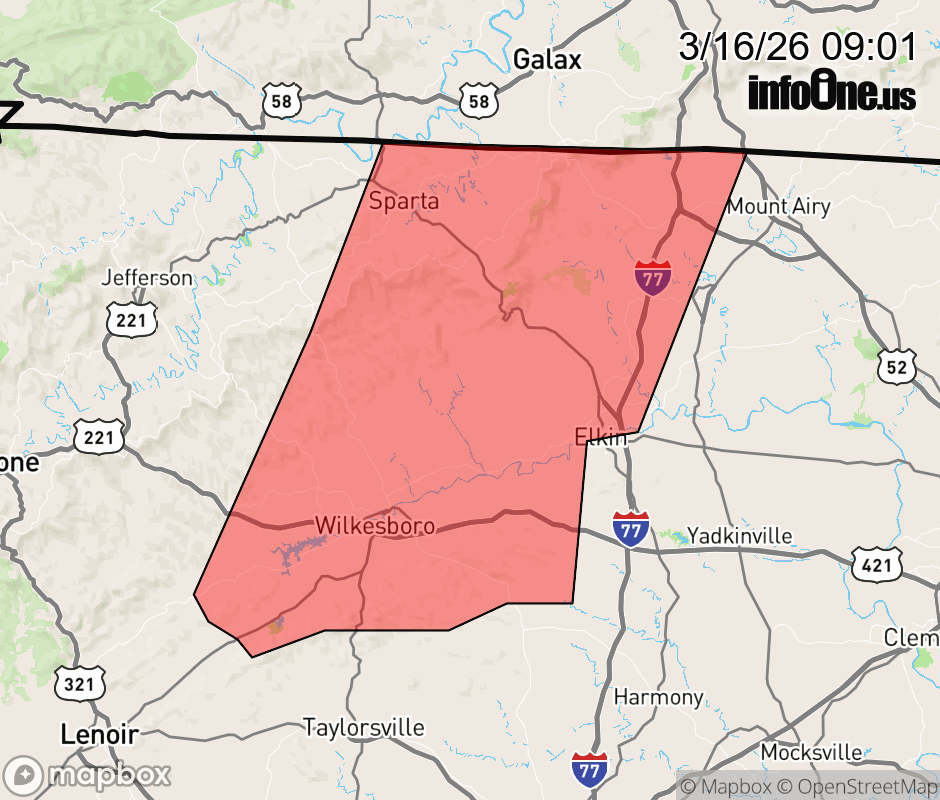 Canceled 3/16/26 9:16 AM Severe Thunderstorm Warning issued March 16 at 9:00AM EDT until March 16 at 9:30AM EDT by NWS Blacksburg VA At 859 AM EDT, severe thunderstorms were located along a line extending from near Ennice to Wilkesboro, moving east at 35 mph. HAZARD...60 mph wind gusts. SOURCE...Radar indicated. IMPACT...Expect damage to roofs, siding, and trees. Locations impacted include... North Wilkesboro... Elkin... Wilkesboro... Sparta... Dobson... Ronda... and Traphill. ![]() |