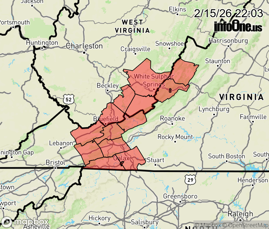 Canceled 2/16/26 8:44 AM Dense Fog Advisory issued February 15 at 10:02PM EST until February 16 at 10:00AM EST by NWS Blacksburg VA * WHAT... Visibility one quarter mile or less in dense fog. * WHERE... Portions of southwest Virginia and southeast West Virginia. * WHEN... Until 10 AM EST Monday. * IMPACTS... Low visibility could make driving conditions hazardous. ![]() |