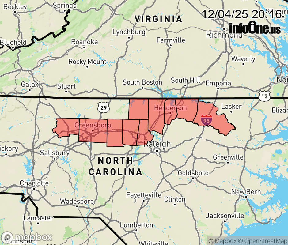 Canceled 12/5/25 2:35 AM Winter Weather Advisory issued December 4 at 8:13PM EST until December 6 at 12:00AM EST by NWS Raleigh NC * WHAT... Mixed precipitation expected. Total snow accumulations up to one inch and a light glaze of ice accumulation are expected. * WHERE... Portions of the northern Piedmont and northern Coastal Plain of central North Carolina, including the following counties, Forsyth, Guilford, Alamance, Orange, Durham, Person, Granville, Vance, Warren, and Halifax. * WHEN... From midnight tonight to midnight EST Friday Night. * IMPACTS... Plan on slippery road conditions. The hazardous conditions could impact the Friday morning and evening commutes. ![]() |