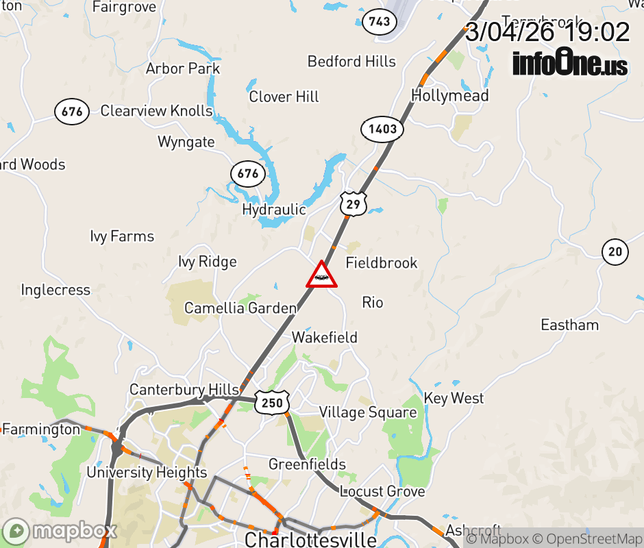 On Rt. 631 in the County of Albemarle, in the vicinity of Seminole Trl; US-29N, motorists can expect delays due to a multi-vehicle crash. The north left shoulder is closed. Updated: Wed 3/4/26 7:02 PM EST ![]() Updated: Wed 3/4/26 7:02 PM EST |