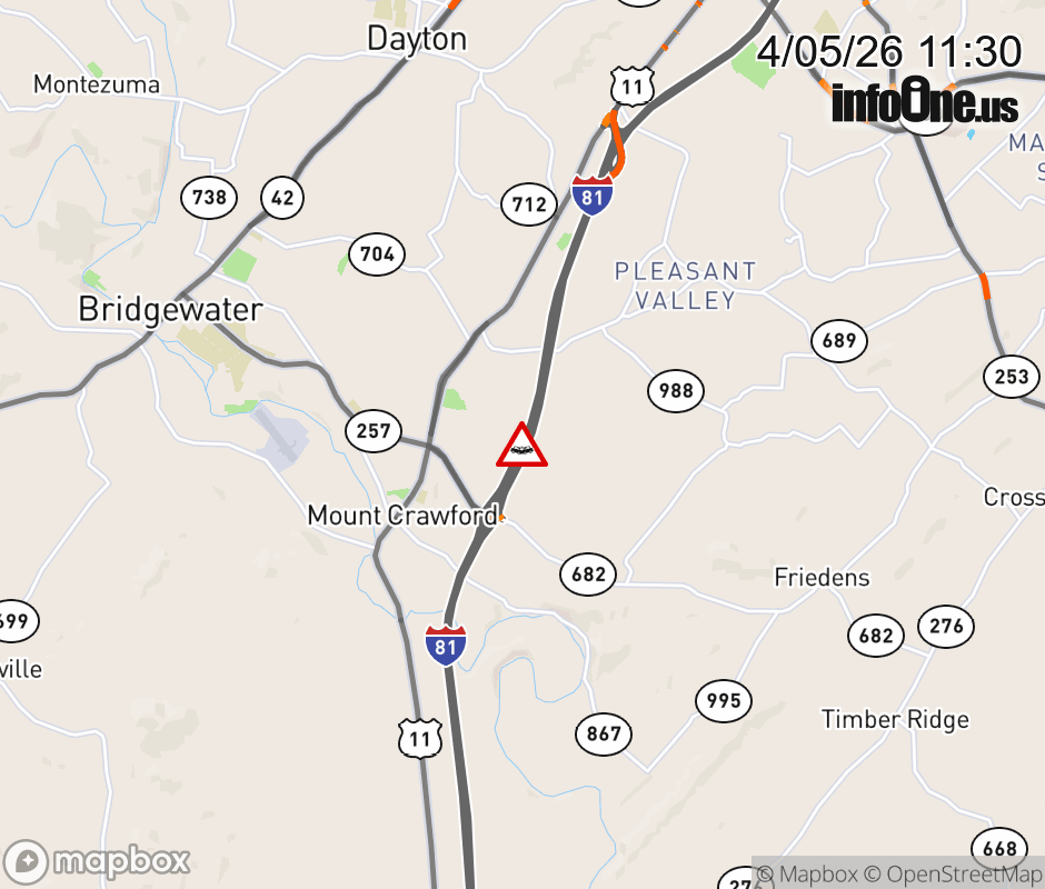 On I-81 South at mile marker 240.7 in the County of Rockingham, motorists can expect delays due to a vehicle crash. Updated: Sun 4/5/26 11:30 AM EDT ![]() Updated: Sun 4/5/26 11:30 AM EDT |