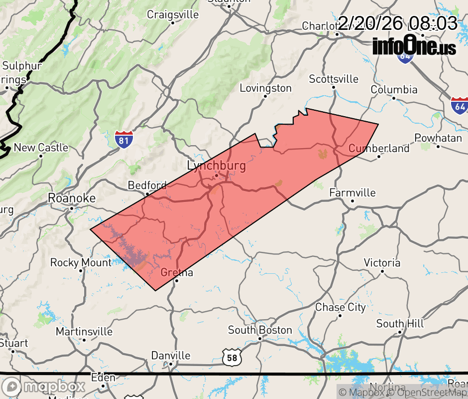 Canceled 2/20/26 8:30 AM Special Weather Statement issued February 20 at 8:01AM EST by NWS Blacksburg VA At 801 AM EST, Doppler radar was tracking gusty showers along a line extending from near Bent Creek to near Northwest Smith Mountain Lake. Movement was southeast at 30 mph. HAZARD...Wind gusts up to 40 mph. SOURCE...Radar indicated. IMPACT...Gusty winds could knock down tree limbs and blow around unsecured objects. Locations impacted include... Lynchburg... Buckingham... Bedford... Altavista... Appomattox... Hurt... and Dillwyn. ![]() |