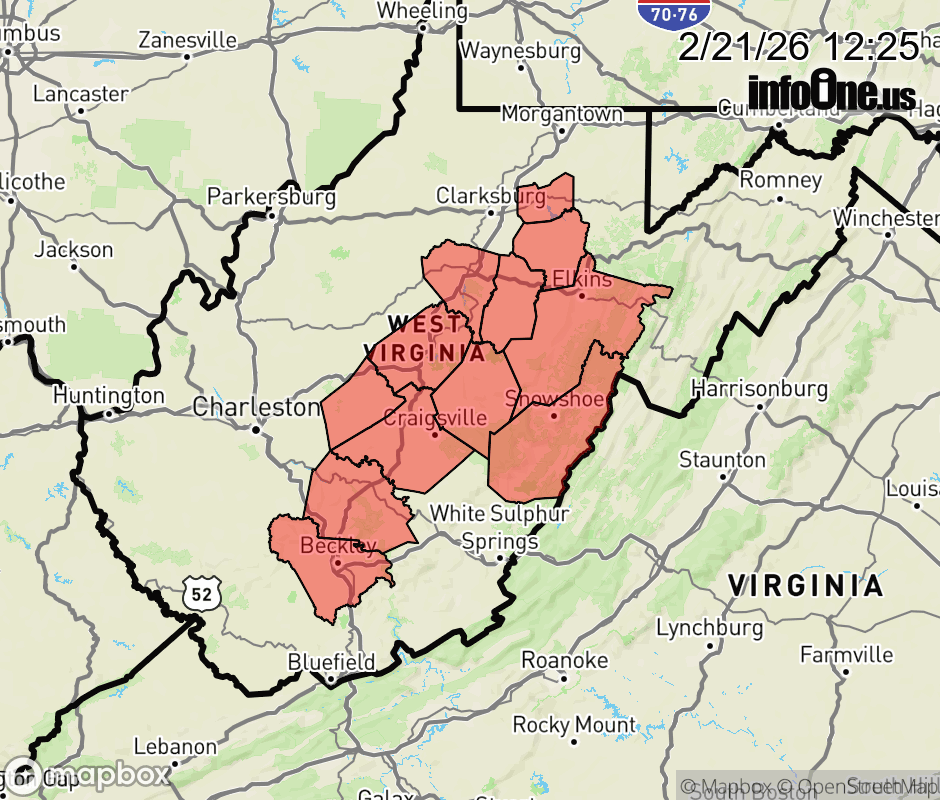 Canceled 2/21/26 3:26 PM Winter Storm Warning issued February 21 at 12:24PM EST until February 24 at 1:00AM EST by NWS Charleston WV * WHAT... Heavy snow expected. Total snow accumulations between 5 and 12 inches. Winds gusting as high as 45 mph. * WHERE... Portions of central, northeast, northern, and southeast West Virginia. * WHEN... From 1 AM Sunday to 1 AM EST Tuesday. * IMPACTS... Roads, and especially bridges and overpasses, will likely become slick and hazardous. Whiteout conditions are expected and will make travel treacherous and potentially life-threatening. Travel could be very difficult to impossible. The hazardous conditions could impact the Monday morning and evening commutes. Gusty winds could bring down tree branches. ![]() |