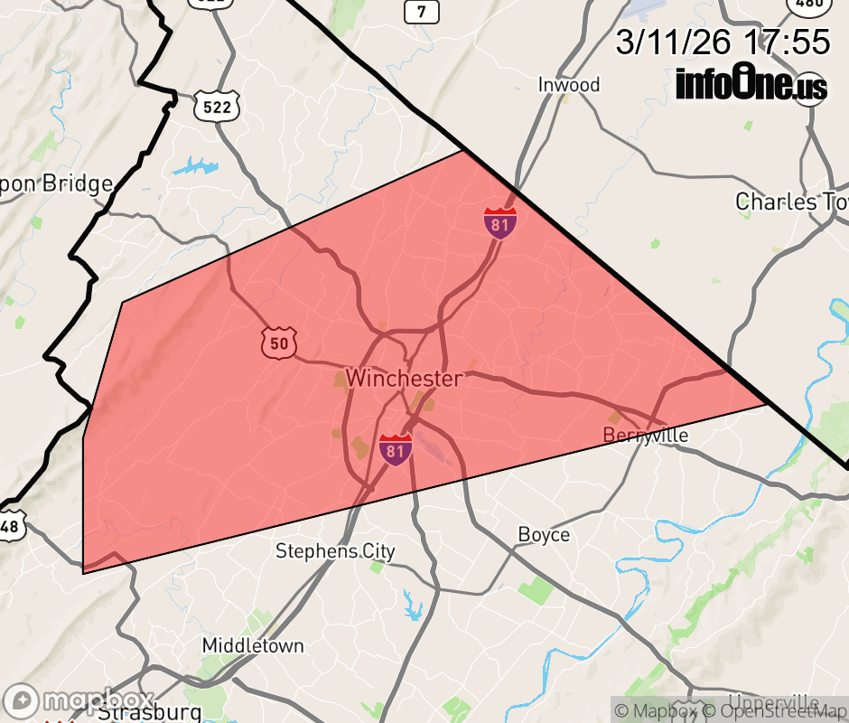 Canceled 3/11/26 6:04 PM Severe Thunderstorm Warning issued March 11 at 5:54PM EDT until March 11 at 6:15PM EDT by NWS Baltimore MD/Washington DC At 554 PM EDT, a severe thunderstorm was located near Winchester, moving east at 40 mph. HAZARD...60 mph wind gusts. SOURCE...Radar indicated. IMPACT...Damaging winds will cause some trees and large branches to fall. This could injure those outdoors, as well as damage homes and vehicles. Roadways may become blocked by downed trees. Localized power outages are possible. Unsecured light objects may become projectiles. Locations impacted include... Winchester, Millwood Pike, Berryville, Brucetown, Greenwood, High View Manor, Wilde Acres, Cedar Grove, Gaylord, Clear Brook, Stephenson, Wadesville, Cedar Hill, Rock Enon Springs, Albin, and Stringtown. ![]() |