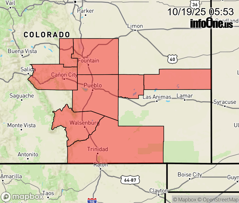 Canceled 10/19/25 10:49 AM Fire Weather Watch issued October 19 at 3:52AM MDT until October 20 at 6:00PM MDT by NWS Pueblo CO * AFFECTED AREA... Fire Weather Zones 222, 226, 227, 228, 229, 230, 231 and 234. * WINDS... North 15 to 25 mph with gusts up to 40 mph. * RELATIVE HUMIDITY... 10 to 15 percent. * IMPACTS... Fires will catch and spread quickly. Exercise extreme caution with any outdoor burning. ![]() |