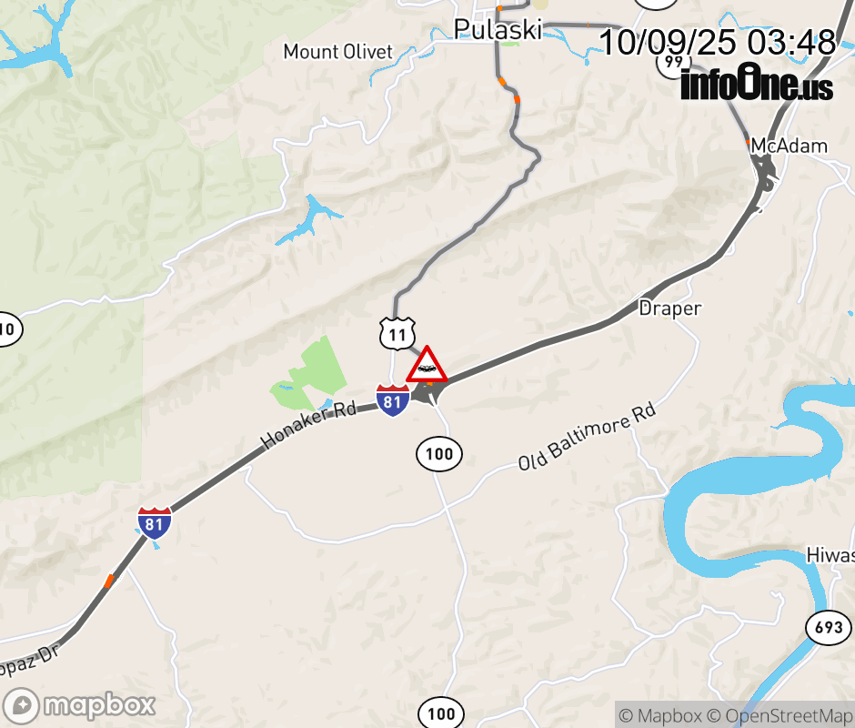 On VA-64 in the County of Pulaski, in the vicinity of Lee Hwy; US-11N/S, motorists can expect delays due to a tractor trailer crash. All east lanes are closed. All west lanes are closed. ![]() |