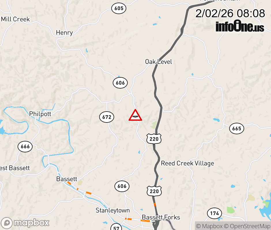 On Rt. 606 North in the County of Henry, in the vicinity of Philpott Dr; Rt. 674E/W (Henry County), motorists can expect delays due to a vehicle crash. Lane closures exist. Updated: Mon 2/2/26 8:08 AM EST ![]() Updated: Mon 2/2/26 8:08 AM EST |