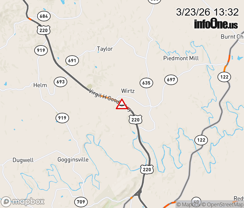 On US-220 in the County of Franklin, in the vicinity of Shepherd Dr; Wescott Rd; Rt. 930E/W (Franklin County), motorists can expect delays due to a vehicle crash. The north left shoulder and left lane are closed. Updated: Mon 3/23/26 1:32 PM EDT ![]() Updated: Mon 3/23/26 1:32 PM EDT |