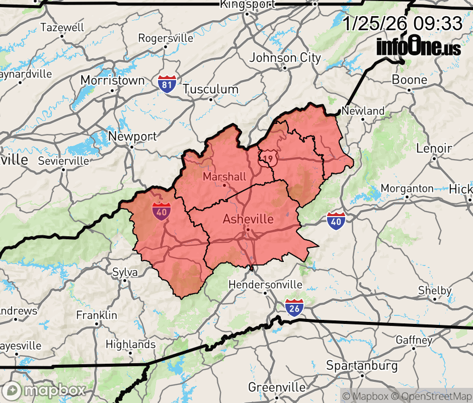 Canceled 1/25/26 1:38 PM Ice Storm Warning issued January 25 at 9:32AM EST until January 26 at 1:00PM EST by NWS Greenville-Spartanburg SC * WHAT... Damaging icing expected. Light additional sleet accumulations and ice accumulations around three tenths of an inch. Winds gusting as high as 50 mph. * WHERE... Buncombe, Haywood, Madison, Mitchell, and Yancey Counties. * WHEN... Until 1 PM EST Monday. * IMPACTS... Significant ice accumulation on power lines and tree limbs may cause widespread and long-lasting power outages. Snow and ice accumulations will make many roads treacherous and impassable. The weight of the snow and ice on tree limbs and power lines could produce numerous outages. The hazardous conditions could impact the Monday morning commute. Gusty winds could bring down tree branches. * ADDITIONAL DETAILS... Precipitation rates are expected to become light late this morning before increasing again this afternoon. The worst impacts are expected this afternoon and evening. Treacherous road conditions and power outages will remain Sunday night and likely linger through at least Monday. ![]() |