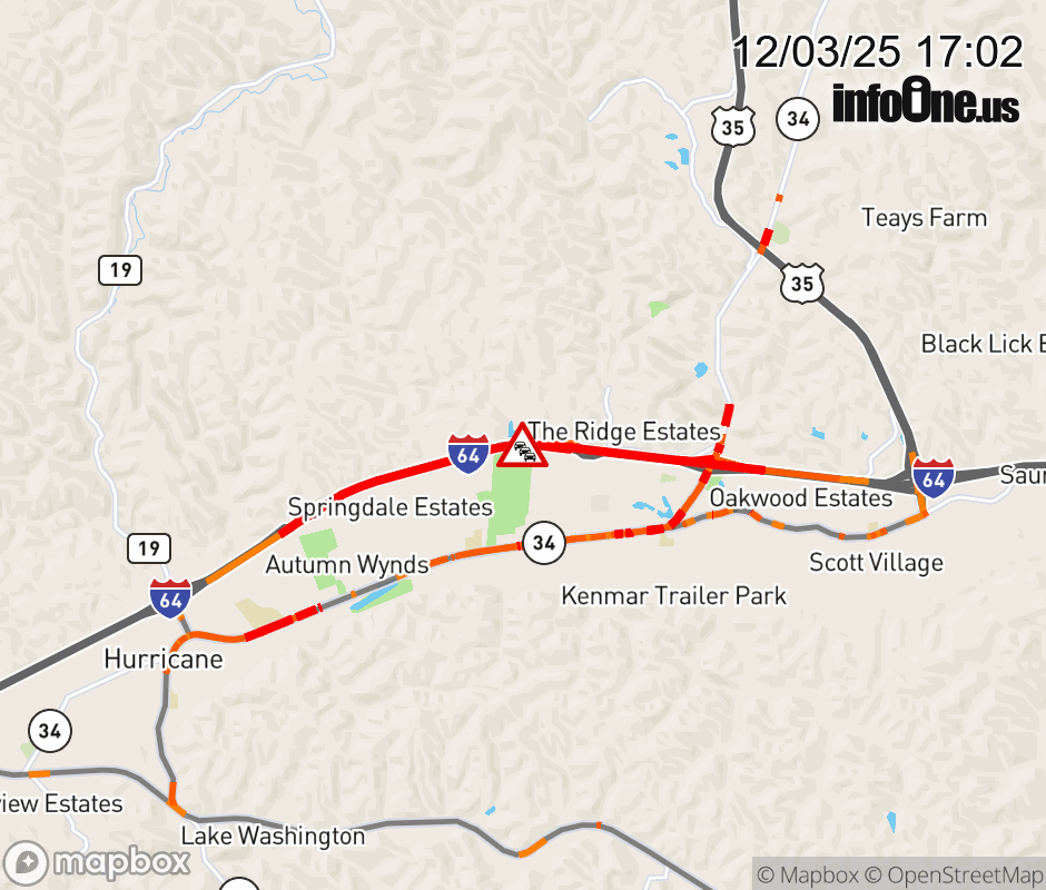 Congestion-Delay on I-64E at Mile Marker 37.0. Updated: Wed 12/3/25 5:02 PM EST ![]() Updated: Wed 12/3/25 5:02 PM EST |