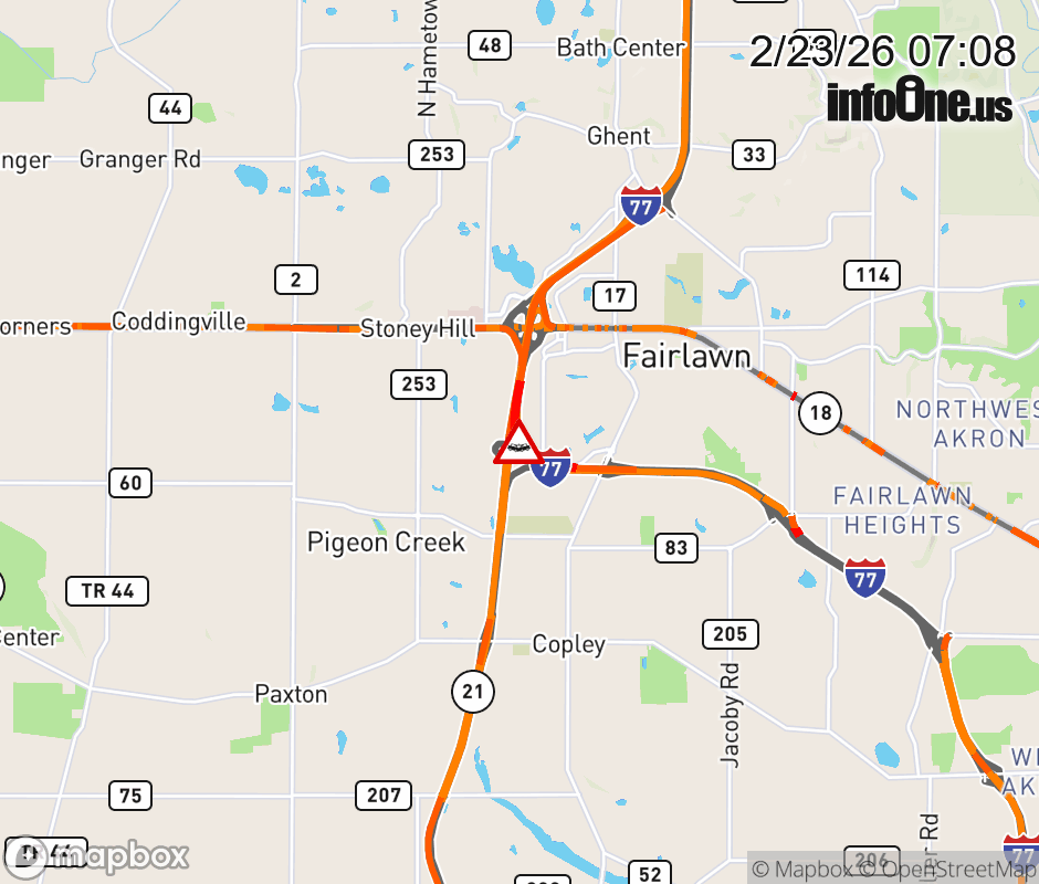 The left lane is blocked on I-77 North beyond SR-21 South, due to a crash. Updated: Mon 2/23/26 7:08 AM EST ![]() Updated: Mon 2/23/26 7:08 AM EST |