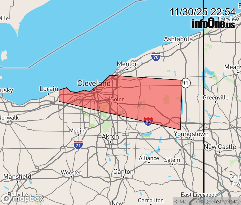 Canceled 12/1/25 12:00 AM Special Weather Statement issued November 30 at 10:51PM EST by NWS Cleveland OH At 1050 PM EST, radar indicated an intense lake effect snow band along a line extending from near Lakewood to near Middlefield, moving southeast at 15 mph. HAZARDS INCLUDE... Visibility rapidly dropping to less than a quarter of a mile... Up to 2 inches of quick snow accumulation... Locations impacted include... Cleveland, Warren, Chardon, Parma, Lakewood, Euclid, Cleveland Heights, Westlake, North Royalton, North Ridgeville, Solon, Avon Lake, Willoughby, Niles, Twinsburg, Warrensville Heights, Macedonia, South Russell, Lordstown, and Middlefield. Use extra caution if you must travel into or through this lake effect snow band. Rapid changes in visibility and potentially slick roads are likely to lead to accidents. Consider delaying travel until this snow band passes your location. ![]() |