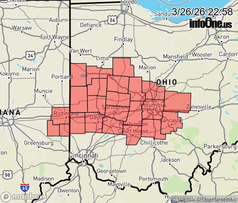 Canceled 3/26/26 11:00 PM Tornado Watch issued March 26 at 10:56PM EDT until March 26 at 11:00PM EDT by NWS Wilmington OH THE NATIONAL WEATHER SERVICE WILL ALLOW TORNADO WATCH 75 TO EXPIRE AT 11 PM EDT THIS EVENING FOR THE FOLLOWING AREAS IN INDIANA THIS ALLOWS TO EXPIRE 3 COUNTIES IN EAST CENTRAL INDIANA FAYETTE IN UNION IN WAYNE IN OHIO THIS ALLOWS TO EXPIRE 20 COUNTIES IN CENTRAL OHIO DELAWARE FAIRFIELD FAYETTE OH FRANKLIN OH LICKING MADISON PICKAWAY UNION OH IN WEST CENTRAL OHIO AUGLAIZE CHAMPAIGN CLARK DARKE GREENE HARDIN LOGAN MERCER MIAMI MONTGOMERY PREBLE SHELBY THIS INCLUDES THE CITIES OF ADA, BEAVERCREEK, BELLEFONTAINE, CAMDEN, CELINA, CIRCLEVILLE, COLDWATER, COLUMBUS, CONNERSVILLE, DAYTON, DELAWARE, EATON, FAIRBORN, GREENVILLE, KENTON, KETTERING, LANCASTER, LIBERTY, LONDON, MARYSVILLE, NEWARK, PICKERINGTON, PIQUA, PLAIN CITY, RICHMOND, SIDNEY, SPRINGFIELD, ST. MARYS, TIPP CITY, TROY, URBANA, WAPAKONETA, WASHINGTON COURT HOUSE, WEST COLLEGE CORNER, WEST JEFFERSON, AND XENIA. ![]() |