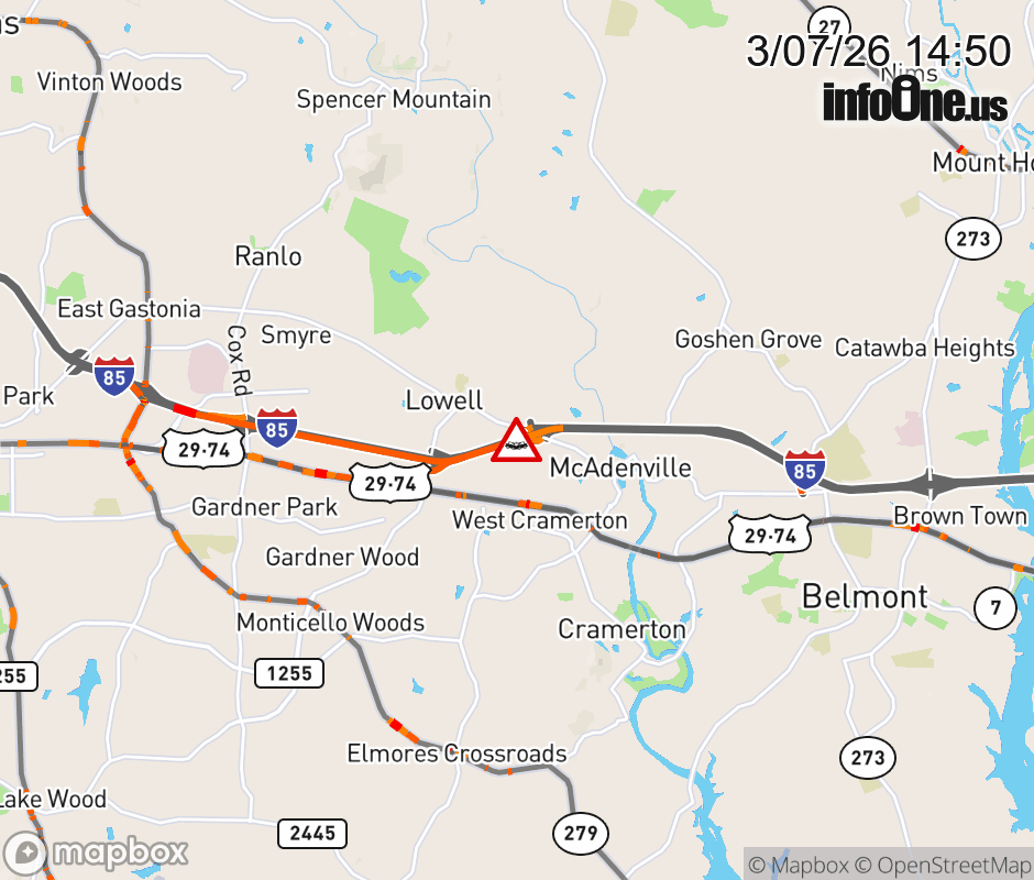 The left lane is closed near Exit 23 (NC 7). ![]() Updated: Sat 3/7/26 2:50 PM EST |