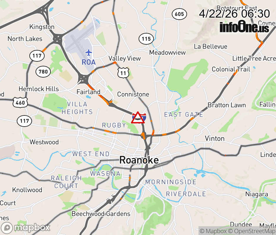 On I-581 at mile marker 1.7 in the County of Roanoke, motorists can expect delays due to a tractor trailer crash. The south right shoulder is closed. Updated: Wed 4/22/26 6:30 AM EDT ![]() Updated: Wed 4/22/26 6:30 AM EDT |