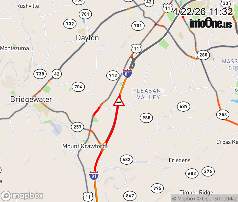 On I-81 North at mile marker 241.8 in the County of Rockingham, motorists can expect delays due to a multi-vehicle crash. Traffic backups are approximately 4.0 miles. Updated: Wed 4/22/26 11:32 AM EDT ![]() Updated: Wed 4/22/26 11:32 AM EDT |