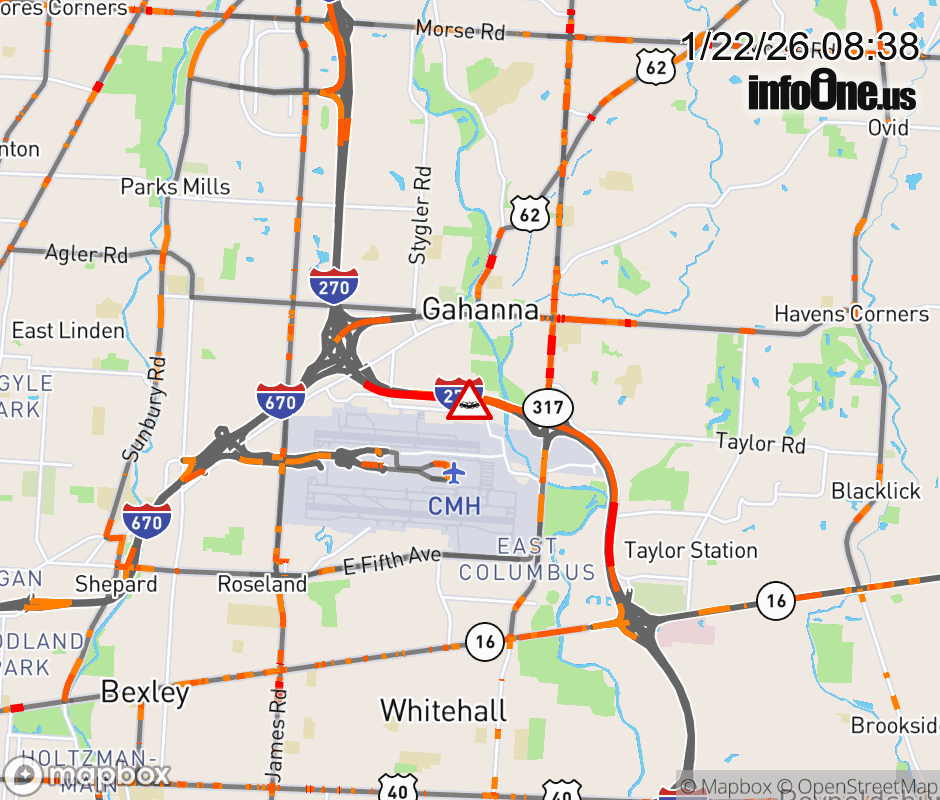 The right lane is blocked on I-270 South beyond US-62 East, due to a crash. Updated: Thu 1/22/26 8:38 AM EST ![]() Updated: Thu 1/22/26 8:38 AM EST |