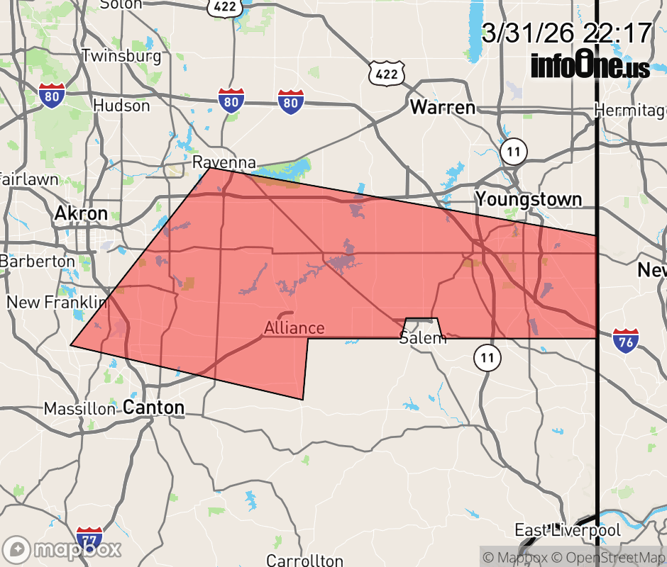 Canceled 3/31/26 10:34 PM Severe Thunderstorm Warning issued March 31 at 10:16PM EDT until March 31 at 11:00PM EDT by NWS Cleveland OH SVRCLE The National Weather Service in Cleveland has issued a * Severe Thunderstorm Warning for... Southern Portage County in northeastern Ohio... Mahoning County in northeastern Ohio... Northern Stark County in northeastern Ohio... Southeastern Summit County in northeastern Ohio... * Until 1100 PM EDT. * At 1015 PM EDT, a severe thunderstorm was located near Hartville, or 12 miles northeast of Canton, moving east at 55 mph. HAZARD...60 mph wind gusts. SOURCE...Radar indicated. IMPACT...Expect damage to trees and power lines. * Locations impacted include... Canton, Youngstown, Salem, Ravenna, Columbiana, Boardman, Green, Alliance, North Canton, Louisville, Canfield, Sebring, Hartville, Austintown, Struthers, Brimfield, Randolph, Lakemore, Atwater, and Edinburg. ![]() |
