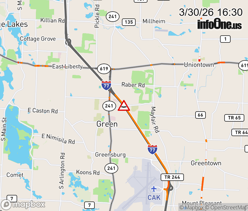 The right shoulder is blocked on I-77 North beyond Akron-Canton Airport, due to a crash. Updated: Mon 3/30/26 4:30 PM EDT ![]() Updated: Mon 3/30/26 4:30 PM EDT |