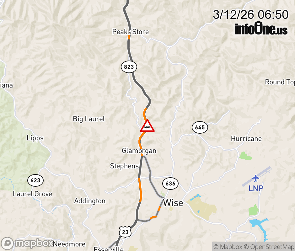On US-23 South in the County of Wise, in the vicinity of Indian Creek Rd; Rt. 823N/S (Wise County), motorists can expect delays due to a vehicle crash. Lane closures exist. ![]() |