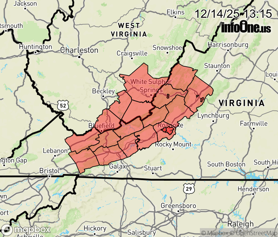 Canceled 12/14/25 7:21 PM Cold Weather Advisory issued December 14 at 1:13PM EST until December 15 at 10:00AM EST by NWS Blacksburg VA * WHAT... Very cold wind chills as low as 15 below. * WHERE... Portions of southwest and west central Virginia and southeast West Virginia. * WHEN... Until 10 AM EST Monday. * IMPACTS... The cold wind chills as low as 15 below zero could result in hypothermia or frostbite if precautions are not taken. Frostbite and hypothermia will occur if unprotected skin is exposed to these temperatures. ![]() |