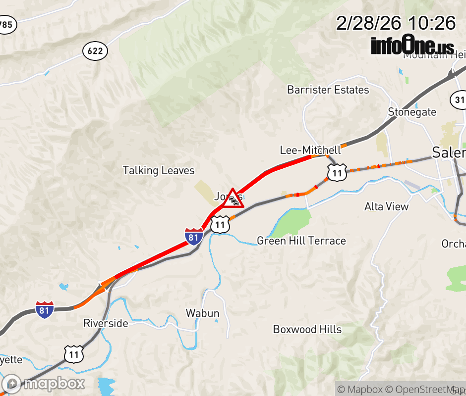 On I-81 at mile marker 135.2 in the County of Roanoke, motorists can expect delays due to a vehicle fire. The north right lane and right shoulder are closed. Updated: Sat 2/28/26 10:26 AM EST ![]() Updated: Sat 2/28/26 10:26 AM EST |