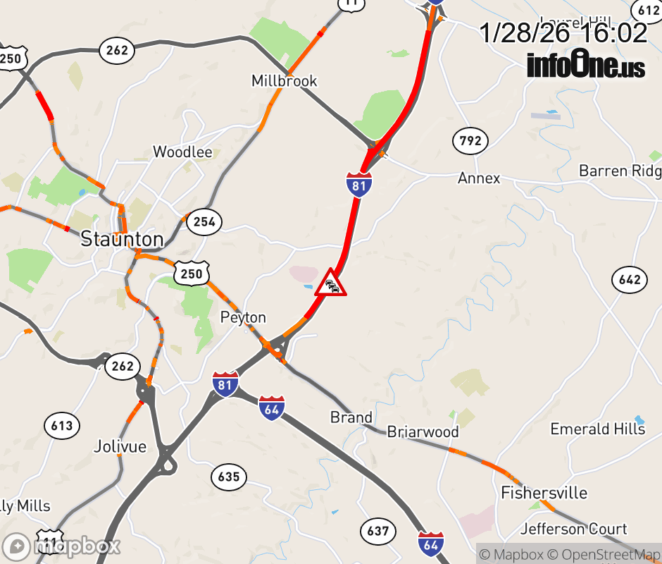 On I-81 South at mile marker 223.8 in the County of Augusta, motorists can expect delays due to a vehicle fire. Traffic backups are approximately 5.0 miles. Updated: Wed 1/28/26 4:02 PM EST ![]() Updated: Wed 1/28/26 4:02 PM EST |