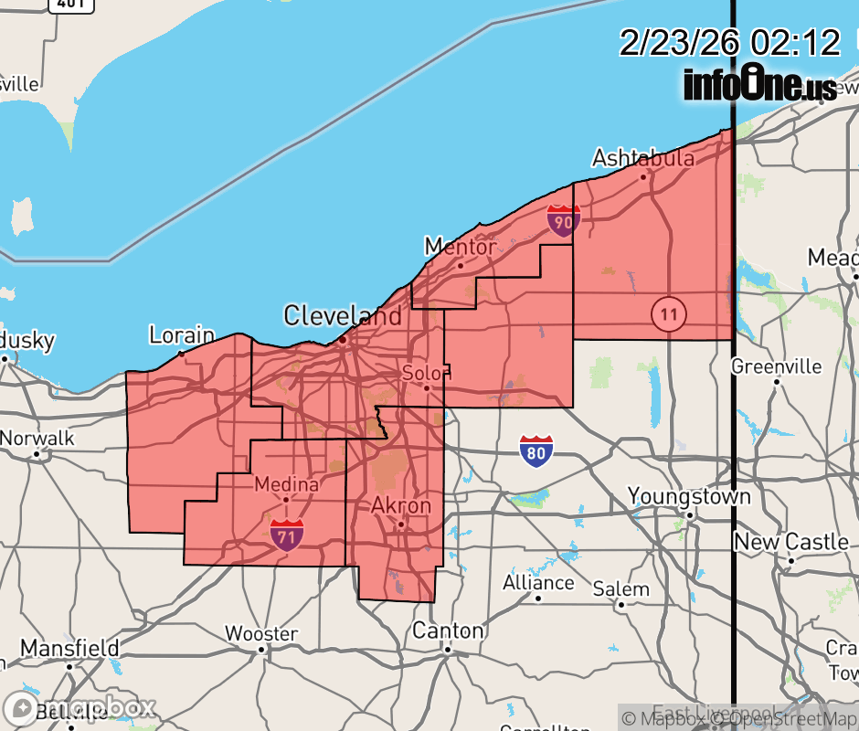 Canceled 2/23/26 10:00 AM Winter Weather Advisory issued February 23 at 2:11AM EST until February 24 at 1:00AM EST by NWS Cleveland OH * WHAT... Lake enhanced snow. Additional snow accumulations between 2 and 4 inches, leading to total accumulations between 3 and 6 inches. Locally higher amounts are possible in the higher elevations of northern Geauga County and eastern and southern Cuyahoga County. Northwest winds gusting as high as 35 mph. * WHERE... Portions of north central and northeast Ohio. * WHEN... Until 1 AM EST Tuesday. * IMPACTS... Plan on slippery road conditions with slower travel likely. The hazardous conditions could impact the morning and evening commutes today. ![]() |