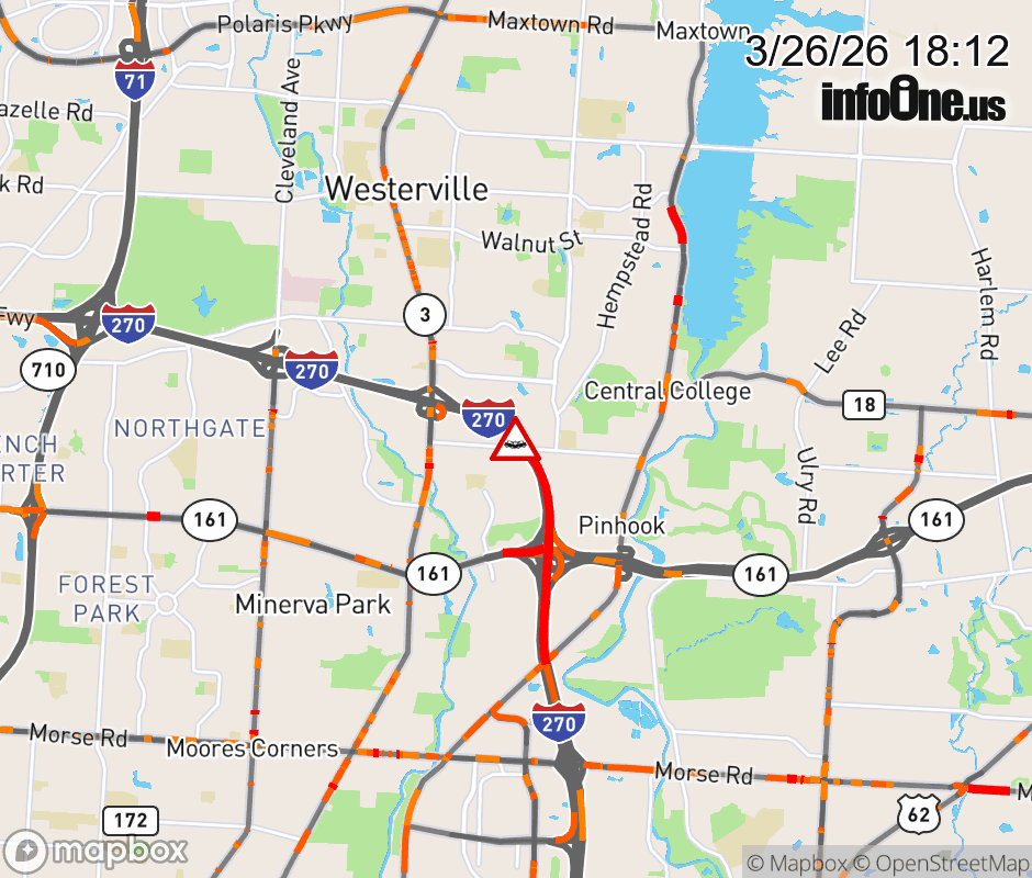 The right lane is blocked on I-270 North beyond SR-161, due to a crash. Updated: Thu 3/26/26 6:12 PM EDT ![]() Updated: Thu 3/26/26 6:12 PM EDT |