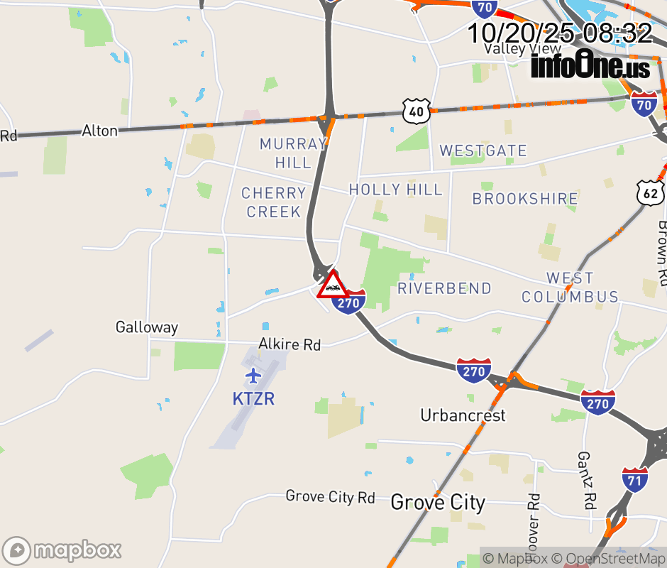 The 2 left lanes are blocked on I-270 West at Georgesville Rd, due to a disabled vehicle. Updated: Mon 10/20/25 8:32 AM EDT ![]() Updated: Mon 10/20/25 8:32 AM EDT |