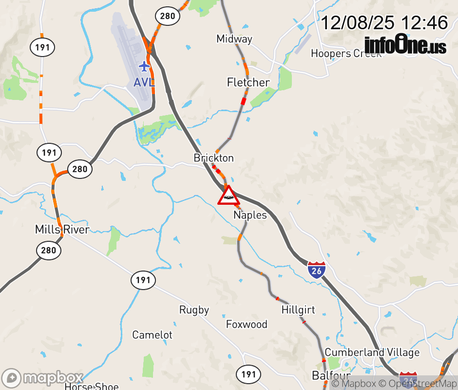 The left lane is closed at I-26. Follow directions of on scene personnel. Updated: Mon 12/8/25 12:46 PM EST ![]() Updated: Mon 12/8/25 12:46 PM EST |