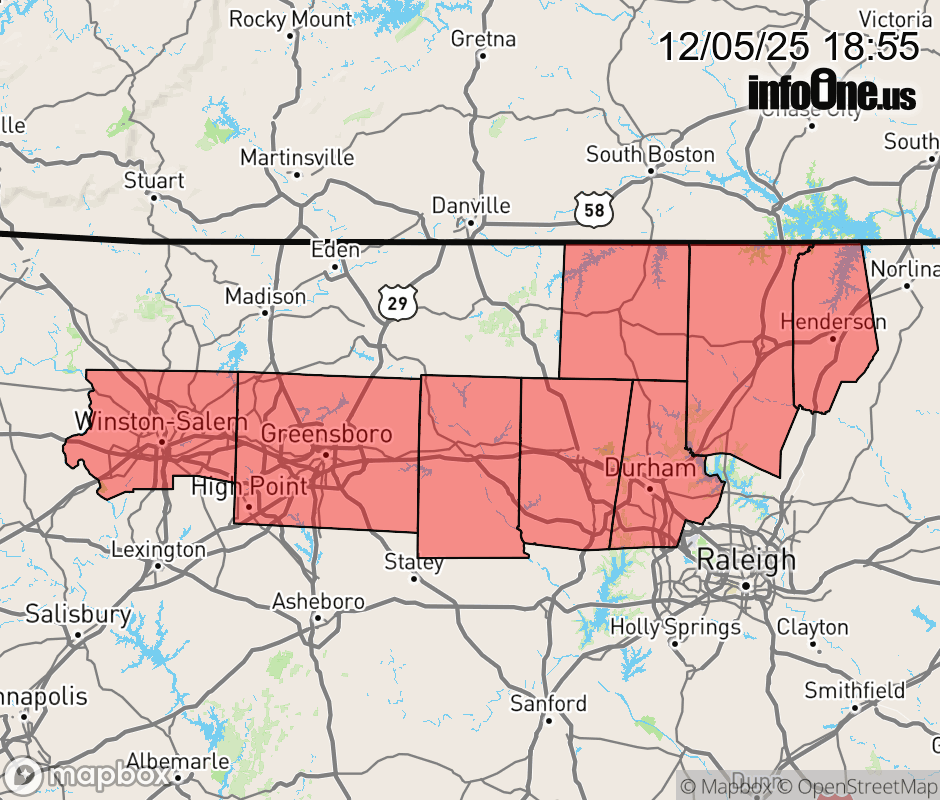 Winter Weather Advisory issued December 5 at 6:54PM EST until December 6 at 8:00AM EST by NWS Raleigh NC * WHAT... Areas of black ice and freezing fog. * WHERE... The far northern Piedmont of central North Carolina. * WHEN... Until 8 AM EST Saturday. * IMPACTS... Untreated roads, and especially bridges and overpasses, will likely become slick and hazardous. Fog may reduce visibilities to less than a half mile. ![]() |