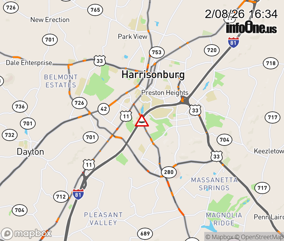On VA-253 in the City of Harrisonburg, in the vicinity of the ramp from and to I-81N, motorists can expect delays due to a vehicle crash. All east lanes are closed. ![]() |