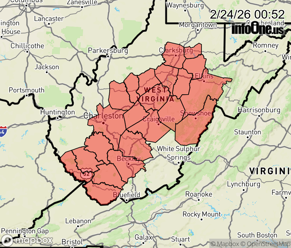 Canceled 2/24/26 1:00 AM Winter Storm Warning issued February 24 at 12:50AM EST until February 24 at 1:00AM EST by NWS Charleston WV Light to moderate upslope snow showers will continue through 4am Tuesday morning. An additional coating to one inch of snow is possible along western favored slopes. Slick travel will remain an issue. Assume any untreated road and surface, including bridges, overpasses, decks, and steps could be icy. If traveling, slow down and exercise caution. Allow plenty of extra time to reach your destination. ![]() |