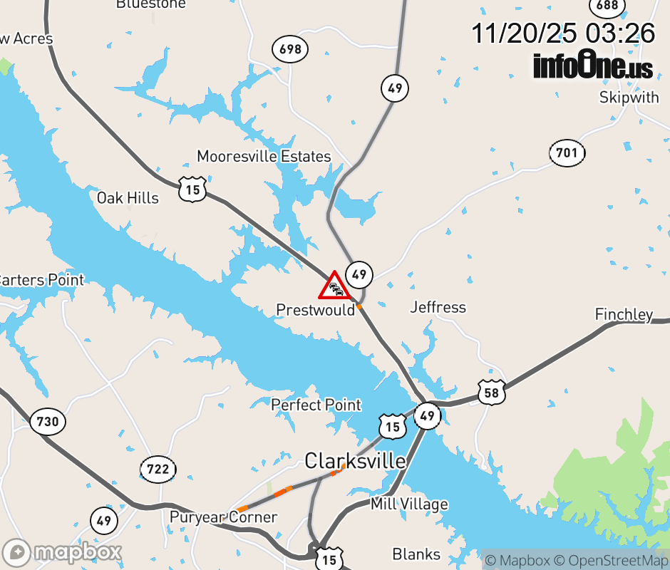 On US-15 North in the County of Mecklenburg, in the vicinity of Prestwould Dr; Rt. 1601E (Mecklenburg County), motorists can expect delays due to weather. Updated: Thu 11/20/25 3:26 AM EST ![]() Updated: Thu 11/20/25 3:26 AM EST |