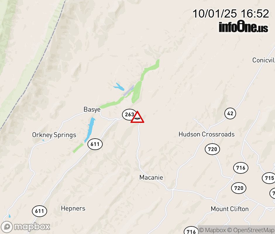 On Rt. 611 in the County of Shenandoah, in the vicinity of Orkney Grade; VA-263E/W, motorists can expect delays due to a vehicle crash. All north lanes are closed. All south lanes are closed. ![]() |