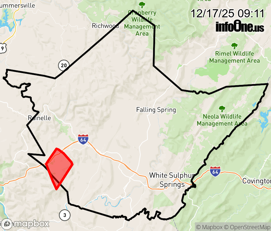 Canceled 12/17/25 10:12 AM Greenbrier County has 1 power outage affecting 266 customers. Appalachian Power 266 without power Alderson: Customers affected: 211 (55%) Estimated repair: Wed 10:00 AM Grassy Meadows: Customers affected: 44 (67%) Estimated repair: Wed 10:00 AM Smoot: Customers affected: 8 (3%) Estimated repair: Wed 10:00 AM ![]() |