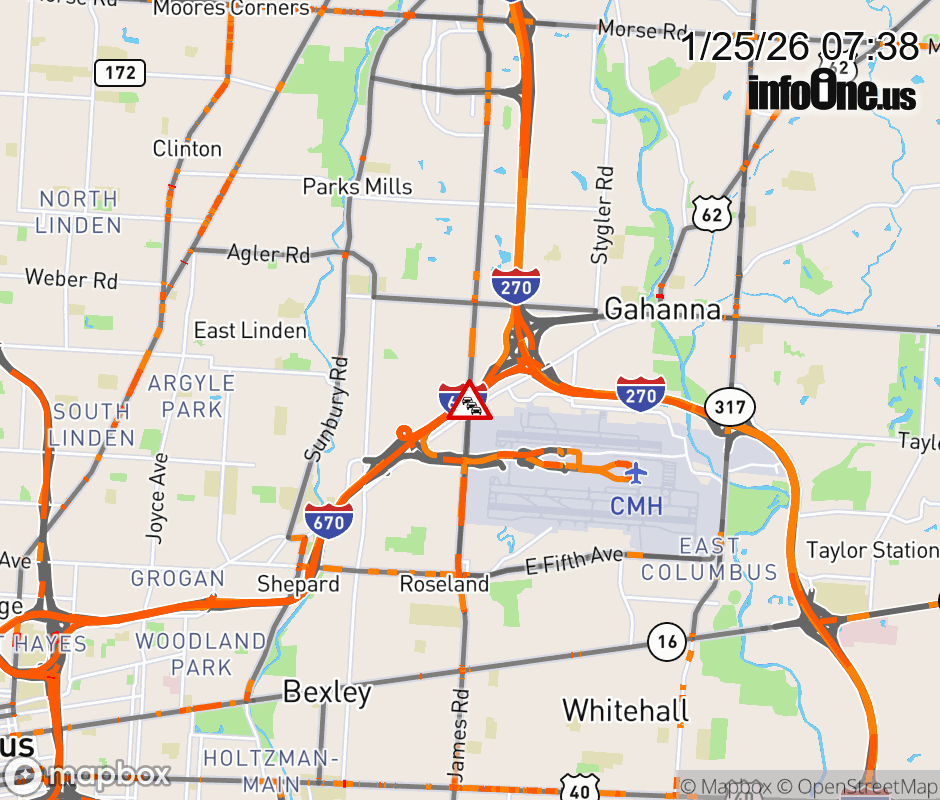 Expect lane closures on I-670/US-62 East beyond Airport/ Stelzer Rd/Johnstown Rd, due to speeds reduced. ![]() |