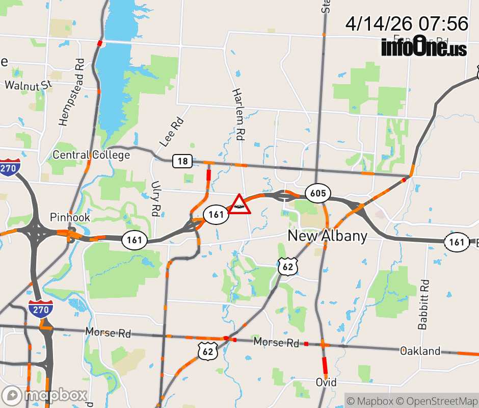 The left lane is blocked on SR-161 East beyond Hamilton Rd, due to a crash. ![]() Updated: Tue 4/14/26 7:56 AM EDT |