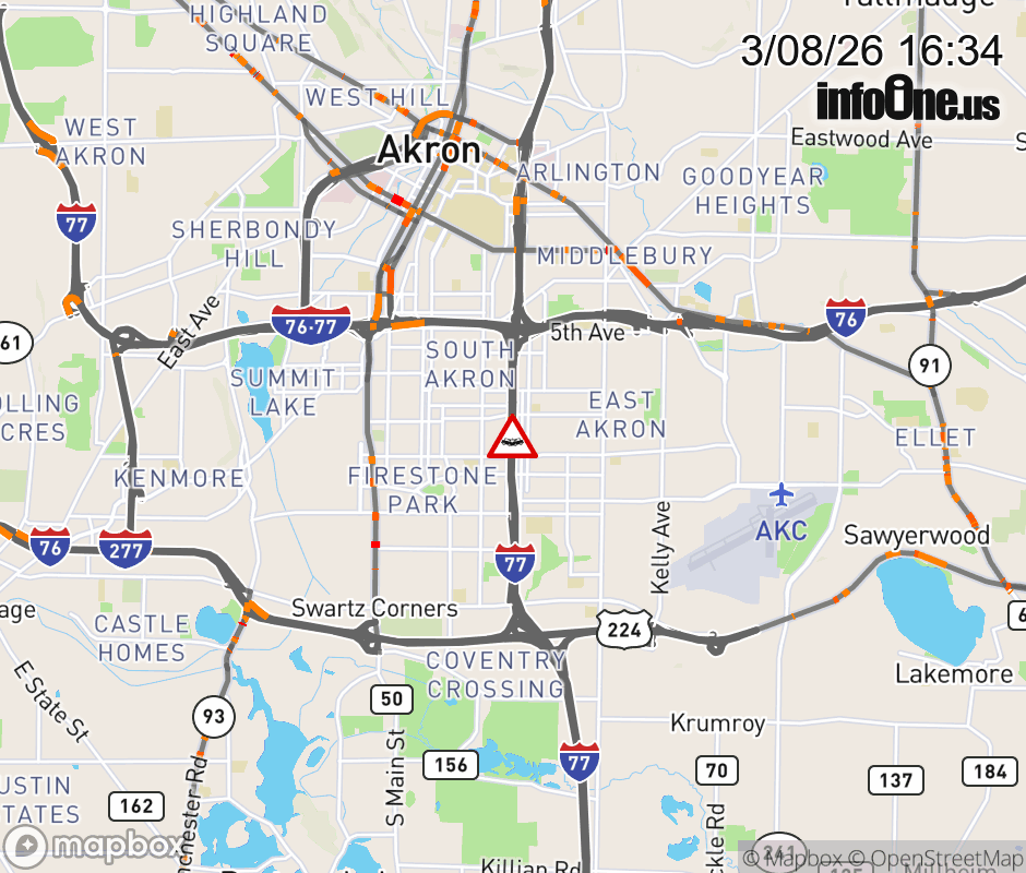 The right lane is blocked on I-77 North beyond SR-764/ Wilbeth Rd/Waterloo Rd, due to a crash. ![]() Updated: Sun 3/8/26 4:34 PM EDT |
