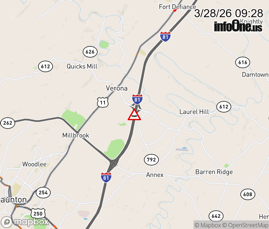 On I-81 at mile marker 227.3 in the County of Augusta, motorists can expect delays due to a vehicle crash. The south left shoulder is closed. ![]() |
