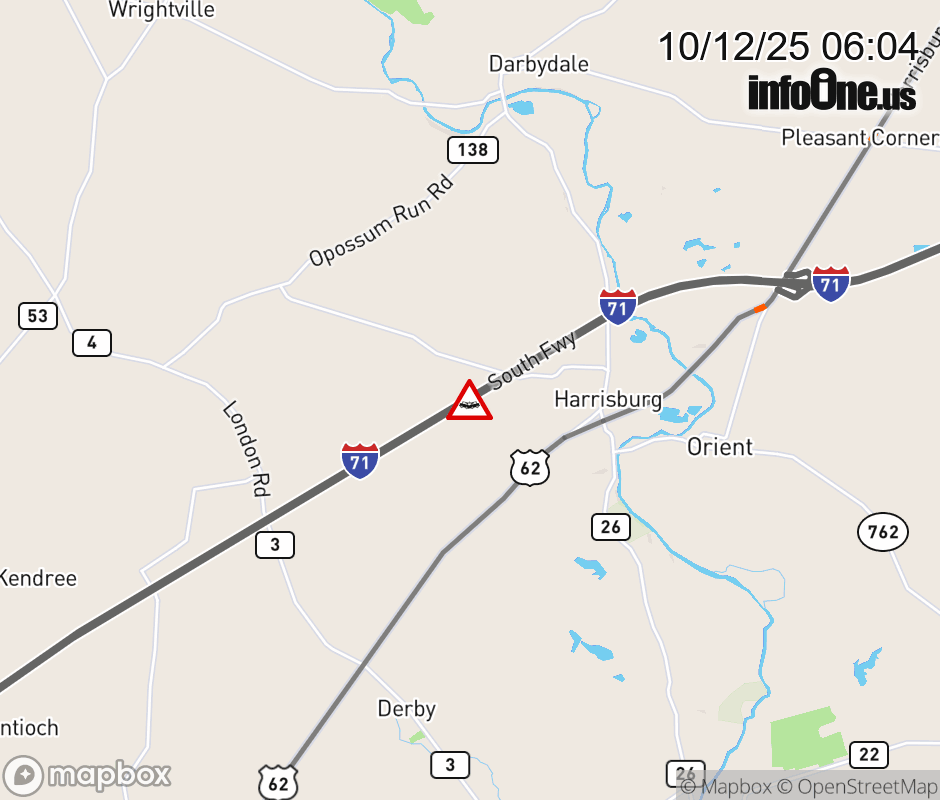 The right lane is blocked on I-71 North beyond SR-56/London/Mt Sterling, due to a crash. Updated: Sun 10/12/25 6:04 AM EDT ![]() Updated: Sun 10/12/25 6:04 AM EDT |