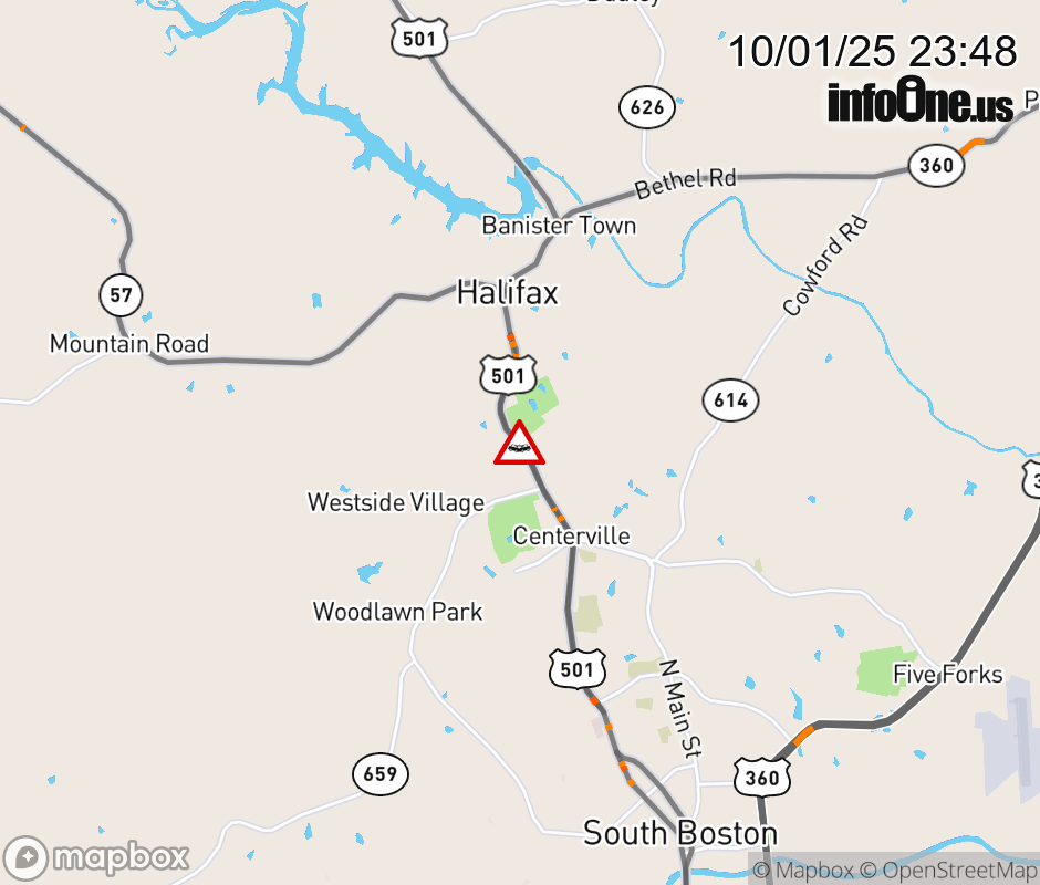 On US-501 North in the County of Halifax, in the vicinity of Golf Course Rd; Rt. 783E/W (Halifax County), motorists can expect delays due to a vehicle crash. Lane closures exist. ![]() |