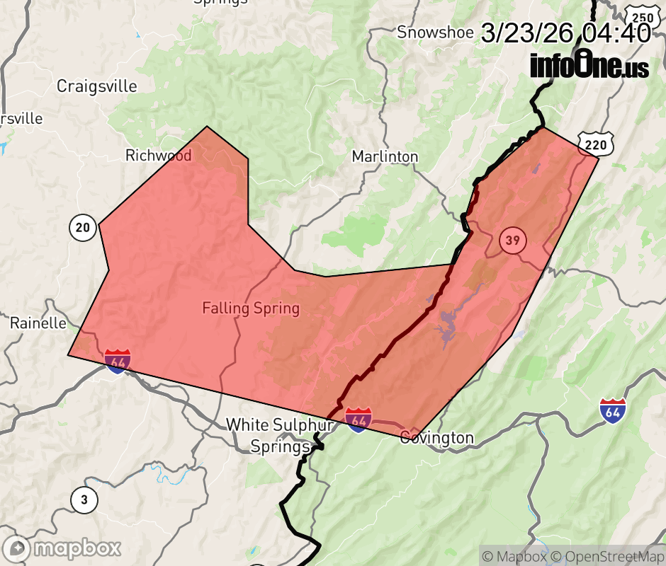Canceled 3/23/26 5:15 AM Severe Thunderstorm Warning issued March 23 at 4:38AM EDT until March 23 at 5:15AM EDT by NWS Blacksburg VA SVRRNK The National Weather Service in BLACKSBURG has issued a * Severe Thunderstorm Warning for... Northwestern Alleghany County in west central Virginia... Western Bath County in west central Virginia... Central Greenbrier County in southeastern West Virginia... * Until 515 AM EDT. * At 438 AM EDT, severe thunderstorms were located along a line extending from 10 miles northeast of Leonard to near Falling Spring to near Meadow Bluff, moving east at 70 mph. HAZARD...60 mph wind gusts. SOURCE...Radar indicated. IMPACT...Expect damage to roofs, siding, and trees. * Locations impacted include... Rupert... Renick... Neola... Hot Springs... Warm Springs... Falling Spring... and Lake Moomaw. ![]() |