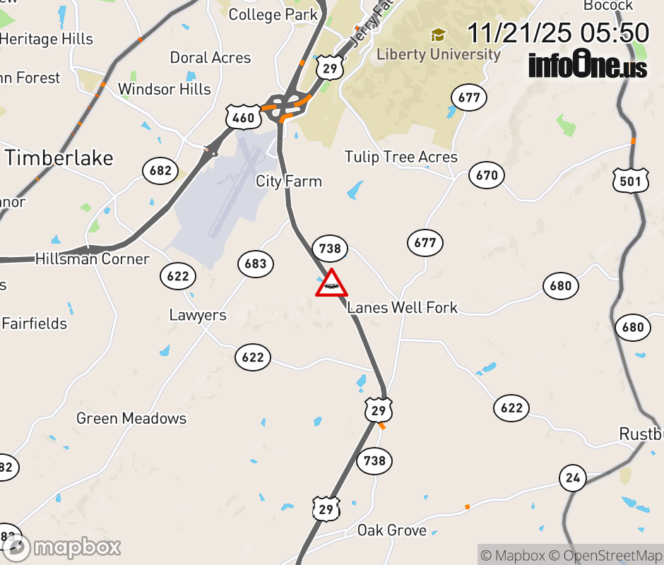 On US-29 in the County of Campbell, in the vicinity of English Tavern Rd; Rt. 738N/S (Campbell County), motorists can expect delays due to a vehicle crash. The north right lane and right shoulder are closed. ![]() |