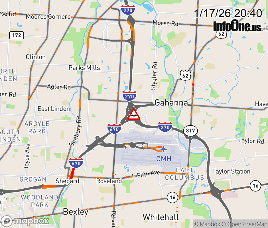 The left lane is blocked on Ramp I-670/US-62 East to I-270 North/Easton Way, due to a crash. ![]() |