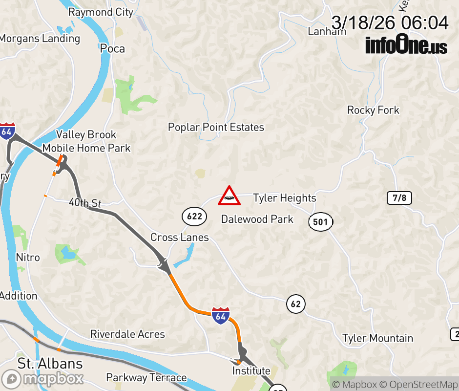 Vehicle Crash on WV-622 (Carleton Ct & Big Tyler Rd). The northbound road is closed. Updated: Wed 3/18/26 6:04 AM EDT ![]() Updated: Wed 3/18/26 6:04 AM EDT |