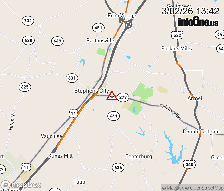 On Rt. 641 in the County of Frederick, in the vicinity of Fairfax Pike; VA-277E/W, motorists can expect delays due to a vehicle crash. The north right shoulder is closed. Updated: Mon 3/2/26 1:42 PM EST ![]() Updated: Mon 3/2/26 1:42 PM EST |