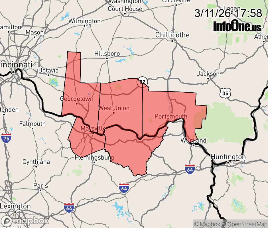 Canceled 3/11/26 6:54 PM Tornado Watch issued March 11 at 5:57PM EDT until March 11 at 7:00PM EDT by NWS Wilmington OH TORNADO WATCH 43, PREVIOUSLY IN EFFECT UNTIL 6 PM EDT THIS EVENING, IS NOW IN EFFECT UNTIL 7 PM EDT THIS EVENING FOR THE FOLLOWING AREAS IN KENTUCKY THIS WATCH INCLUDES 2 COUNTIES IN NORTHEAST KENTUCKY LEWIS IN NORTHERN KENTUCKY MASON IN OHIO THIS WATCH INCLUDES 3 COUNTIES IN SOUTH CENTRAL OHIO ADAMS SCIOTO IN SOUTHWEST OHIO BROWN THIS INCLUDES THE CITIES OF ABERDEEN, CAMP DIX, GEORGETOWN, HEAD OF GRASSY, MANCHESTER, MAYSVILLE, MOUNT ORAB, PEEBLES, PORTSMOUTH, RIPLEY, SEAMAN, TOLLESBORO, VANCEBURG, WEST UNION, WHEELERSBURG, AND WINCHESTER. ![]() |